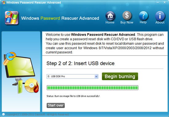 And then insert USB flash drive and click “Begin Burning” button to create a USB windows password reset disk.